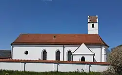 Die gotische Saalkirche wurde im 14./15. Jahrhundert auf romanischer Grundlage erbaut und 1702 barock verändert. Sie besteht aus dem 1848 nach Westen verlängerten Langhaus, dem eingezogenen, von Strebepfeilern gestützten Chor zu einem Joch mit Fünfachtelschluss im Osten und dem Chorflankenturm an der Nordwand des Chors. Die Sakristei steht im Süden vor dem östlichen Joch des Langhauses.
