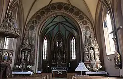 Die neugotische Saalkirche wurde 1881/82 nach Plänen von Michael Gaisberger unter Verwendung von Teilen des spätgotischen Vorgängerbaus errichtet. Sie besteht aus dem Langhaus, dem eingezogenen, dreiseitig geschlossenen Chor im Osten, die beide von Strebepfeilern gestützt werden, der Sakristei an der Südwand und dem Chorflankenturm an der Nordwand des Chors. Zwischen den Giebeln mit den Zifferblättern der Turmuhr erhebt sich ein spitzer Helm. Die Altäre und die Kanzel wurden 1882/83 von Joseph Elsner senior gestaltet.