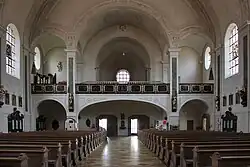 Jeder Besucher, der die Kirche zunächst von außen betrachtet hat, wird überrascht, sobald er durch eine der Türen tritt. Die Weite und Helle des Raumes, die geschmackvolle, auf jeden überflüssigen Prunk verzichtende Einrichtung und die harmonische Aufteilung der riesigen Wand- und Deckenflächen vermitteln einen ersten überzeugenden Gesamteindruck. Zwei bogenförmige Ausbuchtungen an den Längsseiten vergrößern den Raum und durchbrechen das riesige Tonnengewölbe, das scheinbar schwerelos über dem Betrachter schwebt. Zum Chorraum hin senkt sich das Gewölbe, die unübersehbare lateinische Inschrift