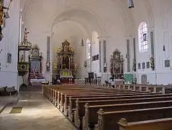 Nach Westen schließt sich das große, äußerlich weitestgehend schmucklose Langhaus an. Die Längsseiten schwingen in der Mitte bogenförmig nach außen. Diese Rundungen werden jeweils durch ein großes dominantes Radfenster durchbrochen. Den Abschluss nach Westen bildet der halbrunde hohe Chorbau, zu dem zwei mit barockem Zierrat gestaltete Aufgänge hinaufführen. Die südliche Nische zwischen Chor und Langhaus schließt die zweigeschossige Sakristei.