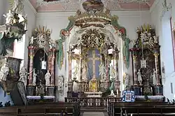 Die Deckenmalereien im Innenraum hat Georg Anton Urlaub 1753 gefertigt. Die drei Altarretabel stammen von Johann Peter Herrlein. Die Schnitzereien am Hochaltar schuf Johann Joseph Keßler. Den Stuck hat Bernhard Hellmuth hergestellt. Die Orgel mit elf Registern im Manual und drei Registern im Pedal wurde 1860 von Johann Caspar Schlimbach gebaut.[1]