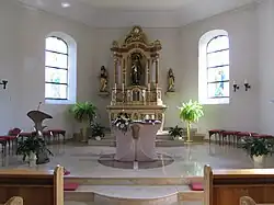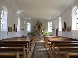 Im Inneren der Kirche befindet sich ein reich gestalteter Hochaltar mit einer Statue des Kirchenpatrons aus dem 18. Jahrhundert im Rocailleaufsatz. Der Altar soll aus dem ehemaligen Franziskanerkloster Homburg stammen.[3]