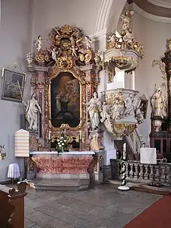 Der freistehende Hauptaltar ist um 1756/59 entstanden. Er hat einen marmorierten Holzaufbau; das Altarblatt zeigt eine dreifigurige Kreuzigungsgruppe in Öl auf einer Leinwand. Darüber befindet sich eine Kartusche mit dem Allianzwappen derer von Rotenhan und Truchsess von Wetzhausen. Auf dem freistehenden Stipes steht ein im Rokoko gestalteter Drehtabernakel. Links vom Altar befindet sich eine Statue des heiligen Wolfgang, rechts eine der heiligen Ottilie.[3]
