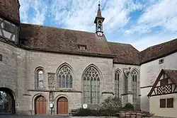 Die Saalkirche aus Quadermauerwerk wurde 1475/93 über den Kasematten der Klingentorbastei erbaut. Sie besteht aus einem Langhaus und einem eingezogenen, mit Strebepfeilern gestützten Chor mit abgesetzten 5/8-Schluss im Osten. Aus dem Satteldach des Langhauses erhebt sich im Osten ein quadratischer Dachreiter, der eine kleine Kirchenglocke beherbergt. In der Achse zwischen den beiden Portalen in der Südwand des Langhauses befindet sich in einer Nische ein Sitzbild des heiligen Wolfgang und darüber ein Relief mit einer Kreuzigungsgruppe. Die drei Joche des Langhauses sind mit einem Sterngewölbe überspannt, die zwei Joche des Chors mit einem Netzgewölbe.