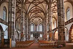 Die evangelisch-lutherische Kirche St. Wolfgang in Schneeberg zählt zu den größten Hallenkirchen der Spätgotik im sächsischen Raum. Sie entstand zu Beginn des 16. Jahrhunderts auf Teilen eines kleineren Vorgängerbaus und gilt als früher Typus eines reformatorischen Kirchengebäudes. Wegen ihres dominanten Standorts auf der Kuppe des Schneeberges, der in vergangenen Jahrhunderten für den Erzabbau aus Gruben und Stollen durchörtert worden war, wird sie auch als Bergmannsdom bezeichnet.[1] Die evangelisch-lutherische Kirchgemeinde St. Wolfgang in Schneeberg besitzt neben der hier beschriebenen Kirche die Trinitatiskirche am Fürstenplatz, die 1567–1575 als Hospitalkirche errichtet wurde und heute als Winterkirche genutzt wird. Die Kirchengemeinde Schneeberg ist mit der St. Georg & St. Martin-Gemeinde in Griesbach verbunden.
