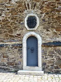 Der Haupteingang zur Kirche befindet sich auf der Nordwestseite des Kirchenschiffes in der Kirchgasse, er wird mit einem kleinen Vorbau geschützt. Ein historisches Wappenrelief schmückt das Zentrum seines Bogens. Die Nebeneingänge haben ebenfalls Rundbogenform mit sparsamem Fassadenschmuck und sind relativ klein.