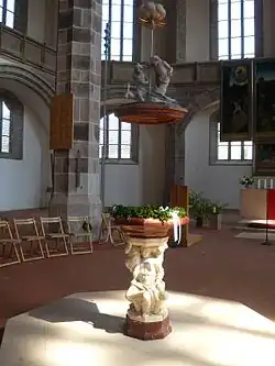 Der Taufstein konnte am Tag des Luftangriffs in der Nachbarschaft untergebracht werden und entging somit seiner Zerstörung.[3] Er wurde restauriert und im Kirchenschiff neu aufgestellt.
