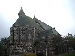 Die St James the Great Episcopal Church steht im historischen Zentrum Stonehavens am rechten Ufer des Carron Waters. Der zahlreiche neoromanische Elemente aufgreifende Bau gehört zu den markantesten Landmarken der Kleinstadt. Das Langhaus der dreischiffigen Kreuzkirche ist fünf Achsen weit. Rundbogenfenster sind entlang der Seitenschiffe und der Obergaden eingelassen. Narthex und das polygonale Baptisterium mit Zeltdach sind vorgelagert. An der Südostseite schließt das Gebäude mit einer halbrunden Apsis. Der schlanke Glockenturm ist weitgehend schmucklos und nur vereinzelt lassen unregelmäßig angeordnete, kleine Öffnungen Licht ins Innere. Sein oberster Bauteil ist gerundet ausgeführt und schließt mit einem schiefergedeckten Kegeldach.[1]