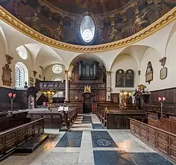 Die Decke wird hauptsächlich von einer Halbrundkuppel gebildet. Sie hat vier elliptische Öffnungen, die nach außen in der Dachgaube nahezu rund sind. Die Kuppel überspannt etwa 13 m (40 Fuß) und ist in vier Backsteinwände eingelassen, ohne Schubelemente von außen. Sie wurde in der heute vorhandenen Gestaltung 1708 ausgemalt. Das geschah im Rahmen einer allgemeinen Verschönerungsaktion.[15] Es wird angenommen, dass der Künstler William Snow die Arbeiten ausführte. Er war ein Mitglied der Worshipful Company of Painter-Stainers, der Zunft der Maler und Färber, einer Livery Company und wohnte in einem Haus nördlich gegenüber der Kirche. In den Kirchenbüchern sind Zahlungen an einen „Mr Snow“ über insgesamt £ 170 verzeichnet, ohne jedoch seine Leistungen im Einzelnen aufzuführen.[11] Die Bemalung in Öl ist direkt auf den Untergrund aufgebracht. Die Dekorationen werden horizontal durch ein Trompe-l’œil-Gesimse im Sinne einer perspektivischen Darstellung zweigeteilt. In dem oberen Teil sind Cherubim dargestellt, die sich anbetend um das Tetragramm, den Namen Gottes in hebräischen Schriftzeichen in einem Strahlenkranz, gruppieren. Unterhalb dieser optischen Unterteilung sind acht sitzende weibliche Figuren einfarbig und scheinbar plastisch aufgemalt. Ihre symbolische Bedeutung ist unklar und war Gegenstand zahlreicher Interpretationsversuche.[11] Die Malerei wurde einmal im 18. Jahrhundert und zweimal im 19. Jahrhundert restauriert. Nach dem Zweiten Weltkrieg erfolgte erneut eine vollständige Restauration des Gebäudes.[11][16]