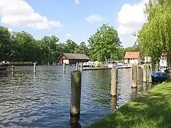 Am Südufer befindet sich unmittelbar neben der Schleuse der Yacht Club Neue Mühle mit einem holzverkleideten Vereinshaus.[2] An das Vereinsgelände schließt sich bis zum Husareneck der Tiergarten an, den der Soldatenkönig Friedrich Wilhelm I. 1725 in einem 900 Hektar großen Waldgebiet östlich seines Jagdschlosses Wusterhausen für die Jagd anlegen ließ. Das Gebiet gehört seit 1995 zum gleichnamigen Naturschutzgebiet Tiergarten. Entlang des Nordufers verläuft eine Uferpromenade, die am Staabe-Freibad Neue Mühle endet.[3]