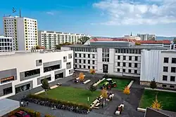 1957/58 errichtetes Gebäude der Ingenieurhochschule Dresden an der Dürerstraße; jetzt Haus 3 des Campus (die linken etwa zwei Drittel bis zum Fallrohr beheimaten einen Teil der Evangelischen Hochschule für Soziale Arbeit)