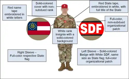 - ein Abzeichen auf der linken Schulter mit der Aufschrift „SDF“ für State Defence Force in weißer Schrift auf einfarbig rotem Hintergrund