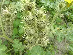 Eine sympodiale Einheit besteht aus zwei Blättern, die zumeist fast paarweise stehen. Die Laubblätter sind eiförmig bis breit eiförmig mit gerundeten oder abgestumpften Lappen. Die Blattspreite ist 7 bis 16 cm lang, entlang der Hauptvenen mit Stacheln besetzt und auf beiden Blattseiten behaart. Der Blattstiel ist 1/3 bis 2/3 so lang wie die Blattspreite und ist ebenfalls mit Stacheln besetzt.