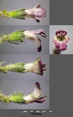 Die zwittrige[5] Blüte ist bei einer Länge von 15 bis 18 Millimetern zygomorph und fünfzählig mit doppelter Blütenhülle.[1][4] Die grünen oder violett-braunen und dicht drüsig-zottig behaarten, meist 11,5 bis 12 (6 bis 13,5) Millimeter langen, ungleichen[3] Kelchblätter sind zu einer etwa 6 Millimeter langen Kelchröhre verwachsen. Die Kelchröhre ist zur Anthese höchstens 10 Millimeter lang.[6] Die fünf Kelchzähne sind bei einer Länge von 3,5 bis 5,5 Millimetern dreieckig mit spitzem oberen Ende.[4] Die fünf 15 bis 22 Millimeter langen, matt-purpurfarbenen bis braun-violetten und lang-zottig behaarten Blütenkrone sind zu einer etwa 10 Millimeter langen Kelchröhre verwachsen, die zweilippig endet.[3][4] Ihre Oberlippe ist 4 bis 7 Millimeter lang und leicht gewölbt.[6][4] Die Kronunterlippe ist 5 bis 12 Millimeter lang sowie etwa 5,5 Millimeter breit mit zwei gerundeten Seitenlappen und einem kreisförmigen, oft tief ausgerandeten Mittellappen.[6][4] Es sind vier Staubblätter vorhanden und ragen aus der Kronröhre heraus.[4] Die Staubbeutel und der Griffel liegen unter der Oberlippe. Die Staubfäden sind dicht behaart. Der grau-rosafarbene[6] Griffel ist zweigabelig.[4]
