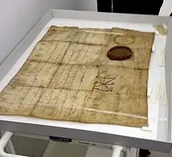Die ältesten vorhandenen Objekte sind eine Urkunde von Kaiser Heinrich II., datiert auf den 21. Januar 1018, die die Übertragung eines Zehntbezirkes für die Abtei Burtscheid besiegelte,[1] und ein Diplom von Kaiser Friedrich I., Barbarossa vom 9. Januar 1166 über die Erteilung des Münz-, Markt- und Stadtrechts für die Stadt Aachen.