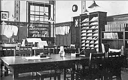 Am 8. Mai 1889 wurde mit der Bücherei in der Talstraße die erste Filiale der Städtischen Volksbibliothek eröffnet.[2] 1906 wurde für die 1904 angegliederte Landesbibliothek ein Erweiterungsbau am Kunstgewerbemuseum Düsseldorf errichtet. Dabei wurde ein Lesesaal, den der Architekt Peter Behrens 1904 als Beitrag zur Louisiana Purchase Exposition entworfen und dort ausgestellt hatte, eingebaut.