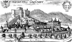 Im Jahre 1346 wurde Gmünd zur Stadt erhoben und wuchs kräftig. Bereits 1339 wurde die Stadtpfarrkirche geweiht.[12] Damals wurde auch die Stadtmauer nach Nordwesten hin erweitert und die neue Kirche in die Stadtbefestigung einbezogen. Das Mauerwerk dieses Mauerteils wird auf 1320–1360 datiert. In dieser Zeit wurde auch im Norden auf einem steil ansteigenden Hügel eine neue Burg mit Bergfried und Wohnturm als Teil der Stadtbefestigung errichtet, die heute als Alte Burg bezeichnet wird.[13] Im 15. Jahrhundert kam es zu einer Auseinandersetzung zwischen dem Salzburger Erzbischof Bernhard von Rohr und Kaiser Friedrich III., bei der 1480 ungarische Truppen Gmünd besetzten. 1487 fiel Gmünd an den Kaiser, bei der vorhergehenden Belagerung wurde die Burg schwer beschädigt. 1502 konnte der Salzburger Erzbischof Leonhard von Keutschach die Stadt wieder zurückkaufen und ließ die nach der Belagerung und einem Stadtbrand von 1504 stark in Mitleidenschaft gezogene Burg wiederherstellen und ausbauen.[14]