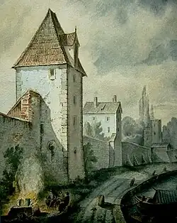 - ↑ Die Halbrundtürme wurden in der Zeit der Neugotik mehrfach verändert. Es wurden pseudo-gotische Maßwerkfenster und Zinnen eingebaut, das alte Vortor entfernt, zwei Fußgängerpforten und eine spitzbogige Durchfahrt eingebaut, die 1903 wieder für die Oberleitung der Straßenbahn entfernt werden musste. Die meisten Teile der neugotischen Überformungen verschwanden 1957.