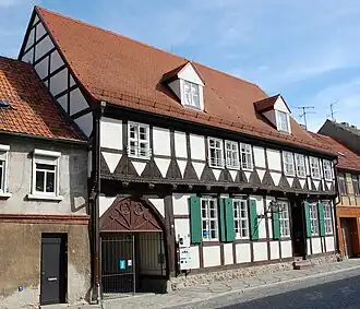 Das Bibliotheksgebäude entstand nach einer an der Stockschwelle befindlichen Inschrift im Jahr 1589. Ursprünglich diente es als Haus des Gewandschneiders Daniel Schinne. Das zweigeschossige Fachwerkhaus ist im Stil der Renaissance gestaltet. Der traufständige Bau ist 16 Gebinde breit. Die Saumschwellen oberhalb der Konsolen sind in Form von Taustäben verziert. Die Fußwinkelhölzer im Obergeschoss sind unbeschnitzt, das Dachwerk ist in der Form des Märkischen Reiterverbandes erstellt. Beides gilt als typisch für die ostelbische Bautradition. Auf der linken Seite des Gebäudes besteht eine spitzbogige Tordurchfahrt.