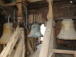 Heute befinden sich wieder drei Glocken im Glockenstuhl. Die mittlere kleine Bronzeglocke wurde im Januar 1901 als Nr. 2057 bei Gustav Collier in Berlin-Zehlendorf aus eroberter von S. M. Wilhelm I. gespendeter Geschützbronze gegossen. Sie wiegt 300 kg, hat einen Durchmesser von 80 cm und ist 65 cm hoch. Sie stammt aus dem Waisenhaus in Potsdam, das im Zweiten Weltkrieg zerstört wurde. Nach der Montage durch die Firma Rohlack aus Goldberg fand am 19. März 1950 die Glockenweihe statt. Da seit 1952 die Gemeinde ohne Küster war, konnte von 1956 bis 1958 die kleine Glocke nicht geläutet werden.[32] Am 7. August 1956 wurde mit der Firma Schilling & Lattermann aus Apolda ein Vertrag zur Lieferung von zwei Eisenhartgussglocken geschlossen. Die größere spendete der damalige Kirchenälteste Landwirt Wilhelm Burmeister. Nach Lieferung der Glocken am 7. April 1957 und deren Montage erfolgte die Glockenweihe am 28. April 1957. Die 1910 aufgestellte Glockenläutemaschine wurde 1957 demontiert, und 1993 erfolgte der Einbau einer elektrischen Läuteanlage.