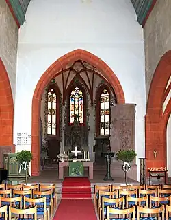 Der Chor wurde im folgenden Jahr, 1543, ebenfalls durch Moritz Lechler neu überwölbt. Statische Probleme hatten sich bereits zuvor durch die Niederlegung der Sakristei zugunsten des Neubaus des Turmes ergeben. Der Chor behielt die nördliche (karolingische) Mauer, nur die südliche wurde weitgehend abgetragen. Das Chorgewölbe ruht auf mit Wappen verzierten Konsolsteinen. Für die Ausführung wählte er ein Kreuzrippengewölbe, die Kreuzungen sind jeweils mit Wappensteinen verziert. Für seine Tätigkeit erhielt er nach dem überlieferten Vertrag 245 Gulden und 10 Malter Korn.[17]