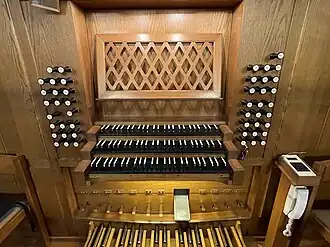 Die Orgel wurde 1982[11] von Mathis Orgelbau AG, Näfels, gebaut. Das Instrument hat 45 Register (Schleifladen mit mechanischer Spiel- und Registertraktur) auf drei Manualen und Pedal, ist regelmässig in Liturgie und Konzerten zu hören und wird auch für Orgelkurse, in Kooperation mit der Diözesanen Kirchenmusikschule St. Gallen, genutzt.[12][13][14] Sie ist nach der Kuhn-Orgel (1963) in der benachbarten Kreuzkirche die zweitgrösste Orgel in der Stadt Wil. 2000 wurde eine Revision und Ausreinigung des Pfeifenwerks durch die Erbauerfirma durchgeführt. Ab Anfang 2026 wird der Emporenboden saniert sowie eine Ausreinigung und umfassende technische Revision der Orgel durch Mathis Orgelbau durchgeführt. Die Disposition:[15][16]