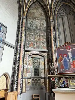 Das grosse Wandbild des Hl. Christophorus an der Nordseite im hinteren Bereich des linken Seitenschiffes entstand um 1400 und wird Hans Haggenberg zugeschrieben; es war ab 1664 weiss überstrichen und wurde beim Umbau der Kirche 1932 wieder freigelegt und von August Schmid (Diessenhofen) restauriert. Im rechts folgenden Joch ist seit 1981 die Ölbergnische zu sehen, die 1867 zugunsten eines gemalten Ölbergbildes entfernt und später im Wiler Stadtmuseum wiederentdeckt worden war; dieses Relief entstand um 1600.[5]