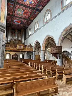 1925 erbaute Orgelbau Kuhn AG, Männedorf, ein Instrument mit 57 Registern (pneumatische Taschenladen) auf drei Manualen und Pedal, unter Verwendung von Pfeifenmaterial aus der Vorgänger-Orgel von Joseph Braun (1866). Das III. Manual wurde als Fernwerk konzipiert, das in einem Schwellkasten im Gewölbe über der Empore platziert war, ebenso wie das Gebläse der Orgel.[26] 1932 wurde das Instrument im Rahmen des Umbaus der Kirche eingelagert und beim Wiedereinbau 1933 auf der neuen oberen Doppelempore um ein Rückpositiv mit sieben Registern ergänzt, das dem II. Manual zugeordnet war.[27] Die Kuhn-Orgel wurde 1981 zu Beginn der Kirchenrenovierung abgetragen und durch ein neues Instrument von Mathis Orgelbau ersetzt. Pfeifenmaterial aus der Braun-Orgel von 1866 wurde zum Teil von Metzler Orgelbau (Dietikon) übernommen; weiteres Pfeifenmaterial der Kuhn-Orgel wurde im Kirchturm von St. Nikolaus eingelagert. Sechs Register der Kuhn-Orgel, darunter ein Register von Joseph Braun (1866; Doublette 2' aus dem II. Manual der Kuhn-Orgel von 1925), fanden 1985 Verwendung beim Bau der neuen Orgel von Lifart Orgelbau AG (Emmen LU) in der katholischen Kirche St. Johannes der Täufer in Tobel TG.[28] Die Disposition der Kuhn-Orgel von 1925:[29][30]
