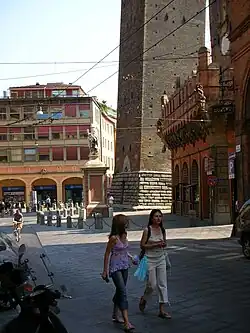 Wahrscheinlich geht sie auf das 8. Jahrhundert zurück, als die Langobarden die Stadt beherrschten und einen weiteren Mauerabschnitt errichteten, der als „langobardische Erweiterung“ bezeichnet wird und sich an die Ostseite des ersten Rings anschließt (ohne jedoch die Kirche Santo Stefano einzubeziehen).[12] Die radiale Entwicklung der heutigen Via Zamboni, Via San Vitale, Strada Maggiore, Via Santo Stefano und Via Castiglione, die von der Porta Ravegnana ausgingen, führte wahrscheinlich dazu, dass die langobardische Siedlung die Form eines Halbkreises annahm, dessen Mittelpunkt die heutige Piazza di Porta Ravegnana war. Das Stadtbild zeigt noch Spuren davon in der kurvenreichen Anordnung der Straßen, die sich um die beiden Türme auf der Ostseite ranken (auf der Westseite fehlen sie).