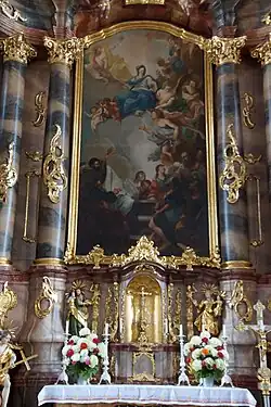 Der Innenraum wird von dem Rokoko-Hochaltar dominiert, der in Gestaltung und Farbgebung perfekt mit den Seitenaltären harmoniert. Der konkave Altaraufbau wird von sechs Kompositsäulen getragen, die – typisch für das Hochstift Eichstätt – in opaken Brauntönen gehalten sind. Oberhalb des vergoldeten Tabernakels mit Aussetzungsnische befindet sich das große Altarblatt mit einem Gemälde des Eichstätter Malers Willibald Wunderer von 1779. Es zeigt das Patroziniumsereignis, Mariä Aufnahme in den Himmel. Auf dem von Voluten begleiteten Altarauszug befindet sich eine Uhr, deren Zifferblatt mit einem Strahlenkranz hinterlegt ist. Rundum sind zehn Puttenköpfe und zwei vollplastische Engelchen angeordnet. Das Hochaltarblatt flankieren überlebensgroße Figuren der Bistumspatrone Willibald (links) und Walburga (rechts).[1][3][4]
