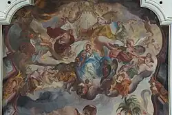 Von besonders reichem Rocaille-Stuck ist das große Deckenfresko von Johann Michael Baader aus dem Jahr 1758 eingerahmt. Es zeigt die himmlische Krönung Mariens durch Gott Vater und Jesus Christus. Vertreter der vier zur damaligen Zeit bekannten Erdteile Europa, Afrika, Asien und Amerika huldigen der Gottesmutter, ebenso der Harfe spielende König David sowie zahlreiche Engel auf Gewölk. Am oberen Bildrand ist unter einem Baldachin die Heilig-Geist-Taube dargestellt, welche die Heilige Dreifaltigkeit vervollständigt. Über der Orgelempore ist ein weiteres, etwas kleineres Fresko zu sehen. Das geschwungen berandete Bild zeigt den Harfe spielenden König David inmitten eines Engelskonzerts.[1][3]