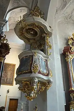 Die ebenfalls im Rokokostil gehaltene Kanzel auf der Epistelseite wurde um 1760 geschaffen und ist ein Werk des Eichstätter Hofbildhauers Matthias Seybold. Sie ist weiß gefasst und mit Vergoldungen in Rocailleform verziert. Sie wird von den Symbolfiguren der vier Evangelisten getragen. An den Kanten des geschwungenen Kanzelkorbs befinden sich Volutenpilaster. Am Schalldeckel ist auf der Unterseite die Heilig-Geist-Taube zu sehen. Außerdem ist ein gleichseitiges Dreieck in einem Strahlenkranz angebracht, das symbolhaft für die Heilige Dreifaltigkeit steht. Oben schwingen sich Voluten zu einem Podest auf, auf dem ein Posaunenengel mit dem Spruchband „Estote Factores Verbi et non auditores tantatum“ thront.[4]