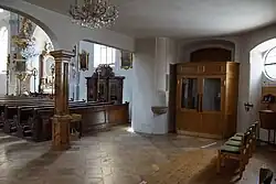 Der weite, lichte Innenraum wird von einer Flachtonne mit Stichkappen überspannt und durch ein auf Pilastern ruhendes, umlaufendes Gebälk sowie rundbogig abschließende Fensteröffnungen gegliedert. Der Chorraum befindet sich seit dem Rokokoumbau nicht mehr im Turmerdgeschoss, das für den jetzigen Hochaltar auch deutlich zu klein bemessen wäre, sondern ist in den Raum vorgerückt und wird durch zwei filigrane, quadratische Freipfeiler optisch begrenzt. An diese Pfeiler lehnen sich die äußerst flach ausgeführten Seitenaltäre an. Die beiden Seitenkapellen auf der Nord- und Südseite, jeweils von einer Quertonne überwölbt, öffnen sich rundbogig zum Hauptraum. Im westlichen Anbau befindet sich vor beiden Portalen je ein kleiner Windfang; außerdem enthält er die Orgelempore.[1][2]