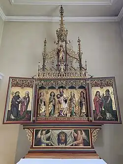 Der kleine Schreinaltar (um 1450) im südlichen Seitenschiff zeigt bei geöffneten Flügeln in der Mitte einen Gnadenstuhl von Franz Josef Simmler sowie vollplastische Statuen des Apostels Johannes (Kelch), der Katharina von Alexandrien (Schwert, Rad) sowie von St. Nikolaus (Stab, Buch, Goldkugeln) und Ägidius (Stab, Buch). Die vergoldeten Flügel sind mit Bildern des Täufers (Buch, Lamm), des Mönchvaters Benedikt (Abtstab, Regelbuch), von St. Wolfgang (Bischofsstab, Kirchenmodell mit Beil) sowie der Äbtissin Radegundis (Buch, abgelegte Krone) bemalt.[4]