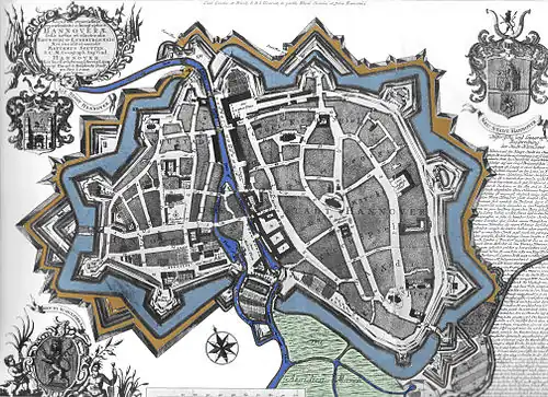 - Um 1750 datiert ein von Matthias Seutter („Geograph Aug. Vind“) stammender kolorierter Kupferstich: Er trägt links unter den Urheberangaben das Wappen der damaligen Churfürstlich Braunschweigisch Lüneburgischen Haupt- und Residenzstadt und rechts das Wappen der Calenberger Neustadt mit dem Parnass-Brunnen. Darunter eine Historische und Geographische Beschreibung der Stadt Hannover; die auf dem Plan aufdruckten Buchstaben weisen auf eine erläuternde Legende hin.[9]