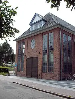 Die Maschinenhalle der Stadtwerke Eckernförde gilt als Kulturdenkmal (Objekt-Nr.: 11329).[8] Sie wurde 1912 von Hans Wolter, Lehrer der Baugewerkschule Eckernförde, entworfen und wird dem auslaufenden Jugendstil zugerechnet.[9] Seinerzeit war in der Halle das erste Elektrizitätswerk der Stadt untergebracht und produzierte Gleichstrom.[9] 1949 begann die Umstellung auf Drehstrom.[9] Seit 1997 steht in der Maschinenhalle ein Blockheizkraftwerk.[9] Das Gebäude steht unter Denkmalschutz[9] und ebenfalls der kleine Wasserturm einige Meter westlich der Halle (Objekt-Nr.: 7081).