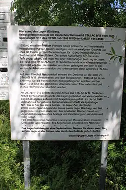 Heute befindet sich auf dem Gelände des Stalag IVB eine Gedenkstätte. Von den Gebäuden des Stalag IVB sind nur noch einige Fundamentfragmente vorhanden. Auf einem Weg durch das Gelände können sich die Besucher seit 2012 auf 17 Glasstelen über die Bedingungen im Stalag IVB und im sowjetischen Speziallager informieren.[5] Niederländische Kriegsveteranen haben symbolisch eine Barackenfront nachgebaut. Die bundeseigene Bodenverwertungs- und -verwaltungs GmbH hatte Mitte 2016 Käufer für das Bergwerkseigentum auf dem Gelände der Gedenkstätte gesucht, um das Areal zum Kiesabbau zu nutzen. Dies stieß auf vielfältigen Widerstand.[6] Im Februar 2017 wurde jedoch in einer Beratung mit dem Landesamt für Bergbau, Geologie und Rohstoffe Brandenburg beschlossen, die Fläche des Speziallagers Mühlberg vom Kiesabbau auszunehmen.[7]