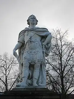 Das Standbild zeigt den Herrscher aufrecht stehend und das rechte Bein leicht vorangestellt. Der mit einem Lorbeerkranz bekrönte Kopf ist ein wenig nach links gewandt. Die rechte Hand stützt sich auf einem Marschallstab ab. An der rechten Hüfte ist ein Schwert befestigt. Gekleidet ist der naturalistisch dargestellte Körper in einem Kostüm, das an einen römischen Imperator erinnert. Der über dem Bauch geknotete Stoffgürtel und der opulent bis in die Sockelzone hinabreichende Mantel entspricht eher einer barocken Gewandfigur. An der Schließe des Mantels ist der englische Hosenbandorden angebracht und an einer breiten Schulterschärpe der preußische schwarze Adlerorden. Auf einem Kissen zu seinen Füßen liegen die von ihm gestifteten Orden Pour la vertu militaire und der Hausorden vom Goldenen Löwen.[2] Neben dem Kissen befinden sich unter anderem ein Helm und ein Harnisch. Johann Georg Meusel beschreibt die Skulptur ausführlich. Er stört sich an der Vermischung von antikem Kostüm und modernem Mantel.