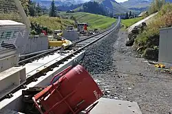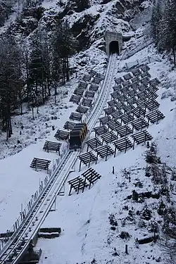 Die Materialseilbahn, mit der Baumaterial und Maschinen hinauf zu den Baustellen transportiert werden sollten, stürzte am 29. November 2013 ein. Dadurch verzögerten sich die Arbeiten erneut um mehrere Monate.[16] Die Bohrarbeiten an den drei Tunneln begannen im Mai 2014, waren aber ebenfalls von Problemen betroffen: Mehrmals mussten Bohrköpfe ausgewechselt werden oder blieben sogar im Fels stecken, wodurch der Eröffnungstermin um weitere zwei Jahre verschoben werden musste und die Kosten sich nunmehr auf 52 Millionen beliefen.[17] Der letzte Tunneldurchstich erfolgte am 15. Februar 2017.[18] Im April 2017 begann der abschliessende Gleisbau mittels einer eigens für dieses Projekt entworfenen Maschine. Bergwärts fahrend verlegte sie vorfabrizierte Beton-Fahrbahn-Elemente von je 5,6 m Länge, inklusive Schienen, Seilrollen und Dienststeg.[19]