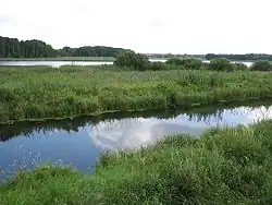 Ausblicke vom Vogelbeobachtungsturm auf Pfefferfließ (rechts) und neue Seen
