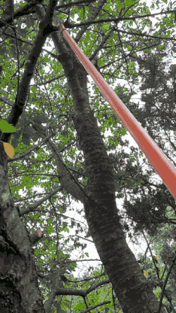 Mit ihr können ohne Einsatz einer Leiter sonst nicht oder auch von einer Leiter aus nicht erreichbare Kronenbereiche beschnitten werden.[3] Mit einer Stangensäge kann beispielsweise schnell und effektiv das Wertästen erfolgen. Die Sägeblätter sind häufig mit Stoß- oder Zughaken versehen, um den Schnitt zu unterstützen und die losen Äste aus der Krone entfernen zu können.[4]