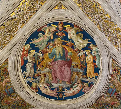 Die theologische Wahrheit findet ihren Ausdruck in der Disputa des allerheiligsten Sakraments, die sich ebenso wie das Fresko in der Sala di Costantino auf den Triumph der christlichen Religion bezieht: Der ganze katholische Glaubenskosmos bestehend aus der Heiligen Dreifaltigkeit samt der Mutter Gottes, den Heiligen, den Patriarchen, den Propheten, den Aposteln, den Kirchenvätern etc. – einige der Personen tragen Gesichtszüge historischer Figuren –, wie er beim fünften Laterankonzil 1512–1517 erneut definiert wurde.