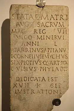 Im Rahmen dieser Verantwortung wurde den vici magistri der Kult der Stata Mater als mit dem Feuer verbundener Gottheit übertragen und hielt nun in jedem einzelnen der 265 von Augustus festgelegten vici Einzug.[4] Auch als die vigiles 6 n. Chr. militärisch in Kohorten organisiert (cohortes vigilum) und aus Freigelassenen gebildet wurden, die Verantwortung für die vigiles somit den Vicomagistri entzogen und einem praefectus vigilum übertragen wurde, verblieb die Sorge für den Kult der Stata Mater in ihren Händen. Hiervon zeugen zahlreiche Inschriften.[5] Eines dieser Stadtviertel war der auf dem Caelius gelegene vicus Statae Matris, der der Gottheit seinen Namen verdankte.[6] Möglicherweise ist auch der auf der basis Capitolina genannte vicus Statae Siccianae aus der 14. Region Roms mit Stata Mater zu verbinden.[7] Außerhalb Roms lässt sie sich etwa in Sutrium nachweisen, wohin sie sich wohl als Teil des Kaiserkultes unter dem Namen Stata Mater Augusta verbreitete.[8]