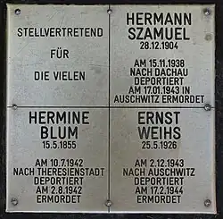 | Hermann Szamuel | Hermann Szamuel (geb. am 28. Dezember 1904) wohnte in der Kugelfanggasse in Floridsdorf. Er wurde am 15. November 1943 ins KZ Dachau deportiert, wurde 1939 ins KZ Buchenwald überstellt, kam 1940 zurück nach Dachau, war dann wieder in Buchenwald. Am 17. Oktober 1942 wurde er ins KZ Auschwitz deportiert, wo er ermordet wurde. | ||||