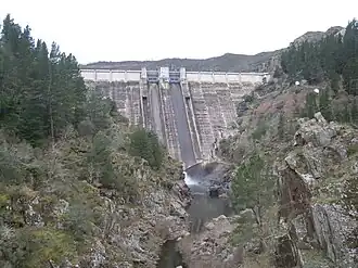 Das Absperrbauwerk ist eine Gewichtsstaumauer aus Beton mit einer Höhe von 107 m über der Gründungssohle. Die Mauerkrone liegt auf einer Höhe von 654 m über dem Meeresspiegel. Die Länge der Mauerkrone beträgt 257 m. Das Volumen beträgt 465.000 m³.[1][2][3]