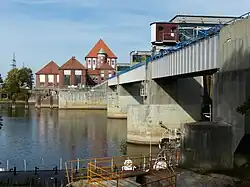 Zwischen Wehr und Wasserkraftwerk ist eine kleine Schleuse integriert (Nutzlänge 28 m, Nutzbreite 6,50 m), die nur vom Wasser- und Schifffahrtsamt genutzt wurde. Die Betreiber des Wehrs und des Kraftwerks haben 2012 die gemeinsame Planung und den Bau einer Fischaufstiegsanlage mit integriertem Abstieg beschlossen. Einen Fischpass gab es jedoch auch schon nach den Umbauarbeiten 1912.[3] Für die neue Pilotanlage wurde die stillgelegte Prahmschleuse genutzt.[6]