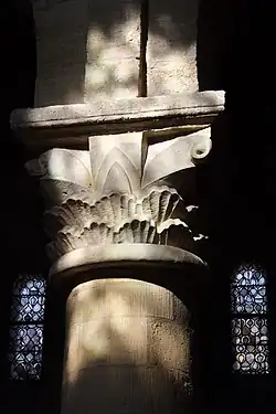- Die Kalksteinschale des Taufbeckens stammt aus dem 13. Jahrhundert. Sie hat die Form eines unregelmäßigen Achtecks. Der obere Rand ist mit einem Weinlaubfries verziert.[7]