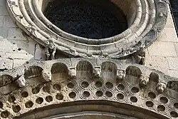 An der Westfassade befindet sich das romanische, von Archivolten gerahmte Hauptportal. Es wird seitlich von zwei mächtigen Strebepfeilern eingefasst. Das Tympanon ist in kleine Quadrate eingeteilt, deren Flächen mit Sternen gefüllt sind. Darüber wölben sich mit Rundstäben verzierte Archivolten. Diese werden von einem Band gerahmt, dessen Dekor aus zwei Reihen kreisrunder, von feinen Linien umschlungenen Öffnungen besteht. In den äußeren Bogen sind ebenfalls feine Linien geritzt, die in Kragsteinen mit skulptierten Köpfen münden. Über dem Portal öffnen sich zwei schmale Rundbogenfenster und in der Mitte ein von profilierten Schmuckrahmen eingefasstes Rundfenster, an dem seitlich und unten zwei kleine Figuren angebracht sind.