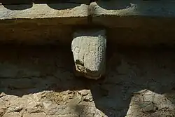 Das Dach liegt auf Gesimsplatten, deren Frontseiten mit einem ornamentalen Fries verziert sind. Die sie stützenden Kragsteine sind ebenfalls skulptiert. Es sind Rosetten oder Tierköpfe zu erkennen.