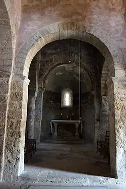 Ein Querschiff ist nicht vorhanden. Die drei Apsiden weisen schmale Rundbogenfenster auf. In der Westwand öffnet sich ein Zwillingsfenster, dessen Mittelsäule wie die Mittelsäulen der Turmfenster mit einem schlichten Kapitell mit geritztem Dekor versehen ist.